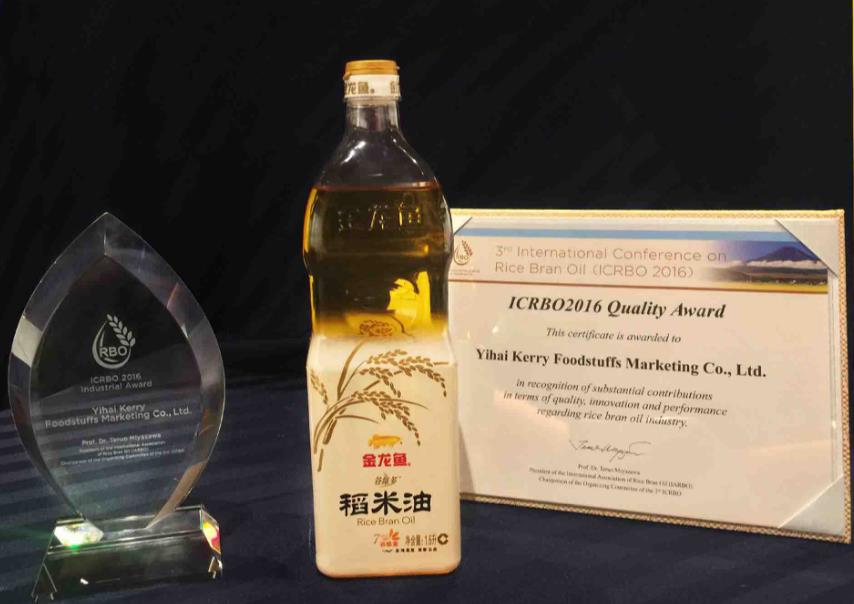 在第三届国际稻米油会议上,金龙鱼稻米油荣获ICRBO-国际稻米油理事会评选的“国际品质大奖“